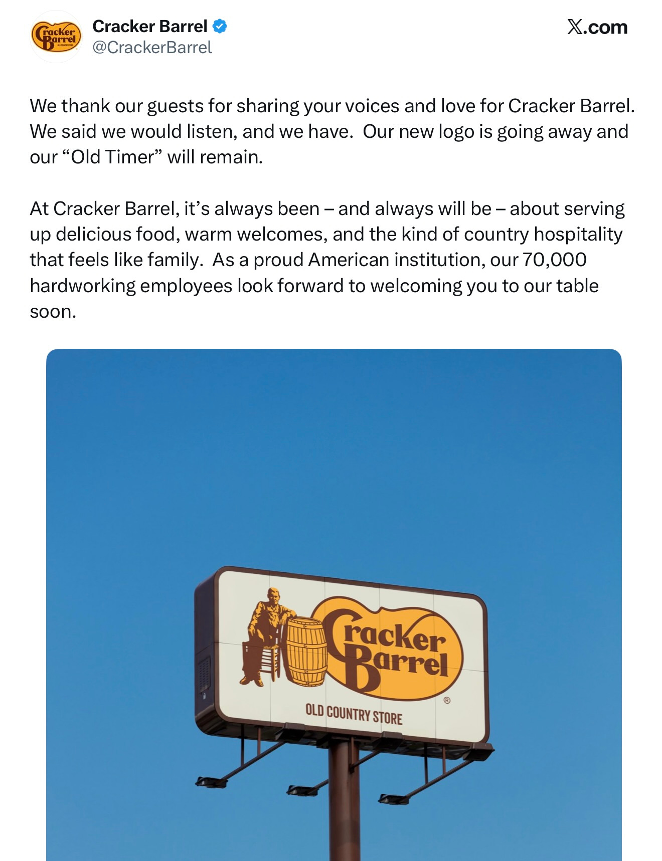 If the last few days have shown us anything, it's how deeply people care about Cracker Barrel. We're truly grateful for your heartfelt voices.