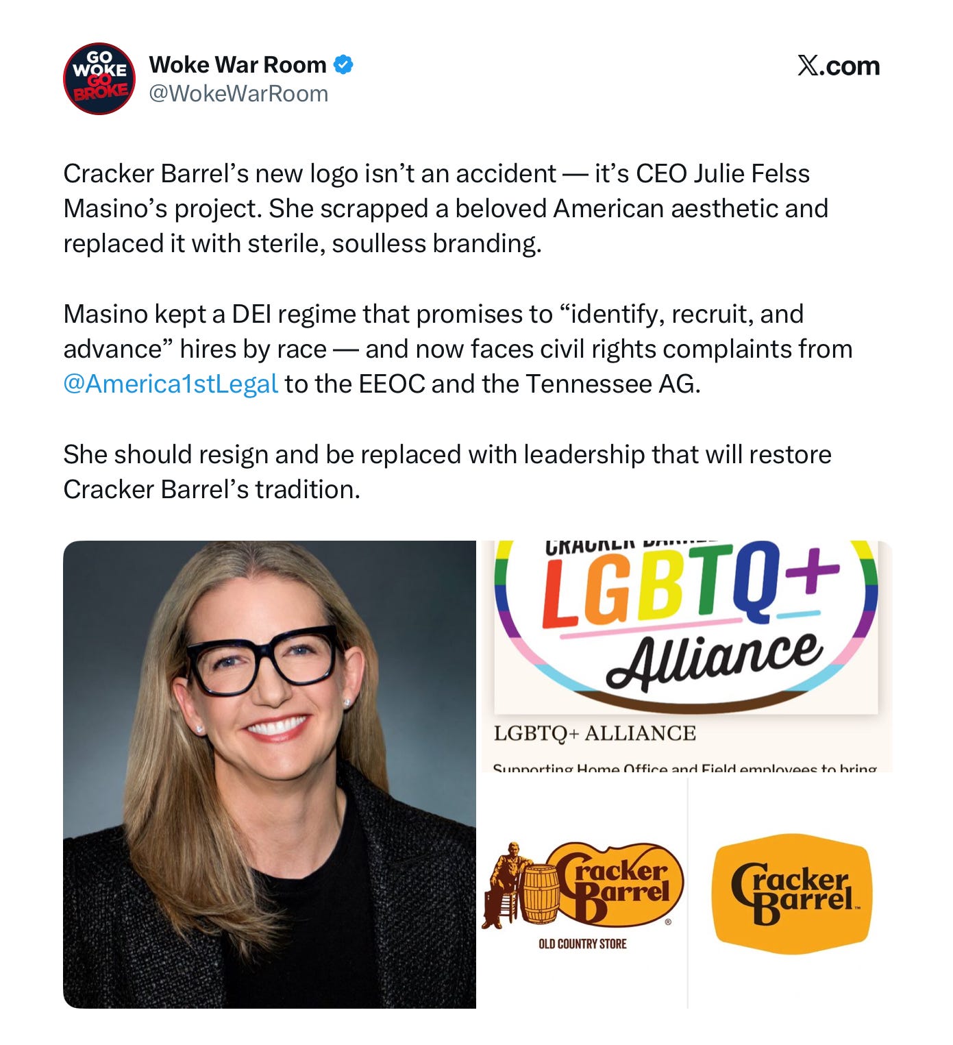 But a loud and vocal portion of ‘The Internet’ decided that the REAL problem with Cracker Barrel’s new logo was that it was… woke.