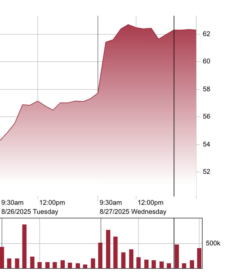 … and the stock price, which had been clawing back its losses, got a nice little bump off the back of the announcement:
